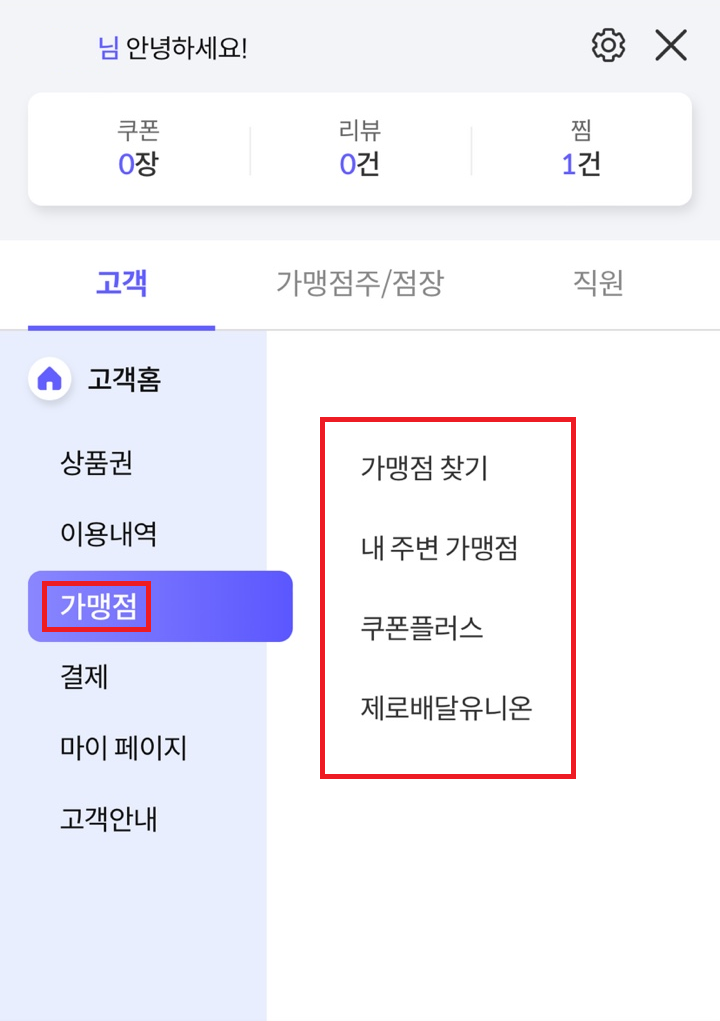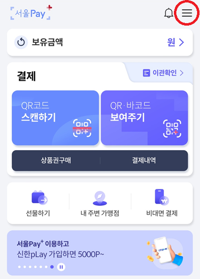 두 번째 방법은 서울 페이+ 앱을 이용하여 알 수 있습니다. 오른쪽 상단의 '三' 모양의 아이콘을 누르고 중간에 있는 가맹점을 클릭하면 서울 페이를 쓸 수 있는 가맹점과 내 주변 가맹점 등을 알 수 있습니다. 가맹점을 찾기 위해서는 보유 상품권을 선택하고 업종 정보를 선택하거나 가맹점 이름을 조회하여 서울 페이를 사용할 수 있는지 알 수 있습니다.