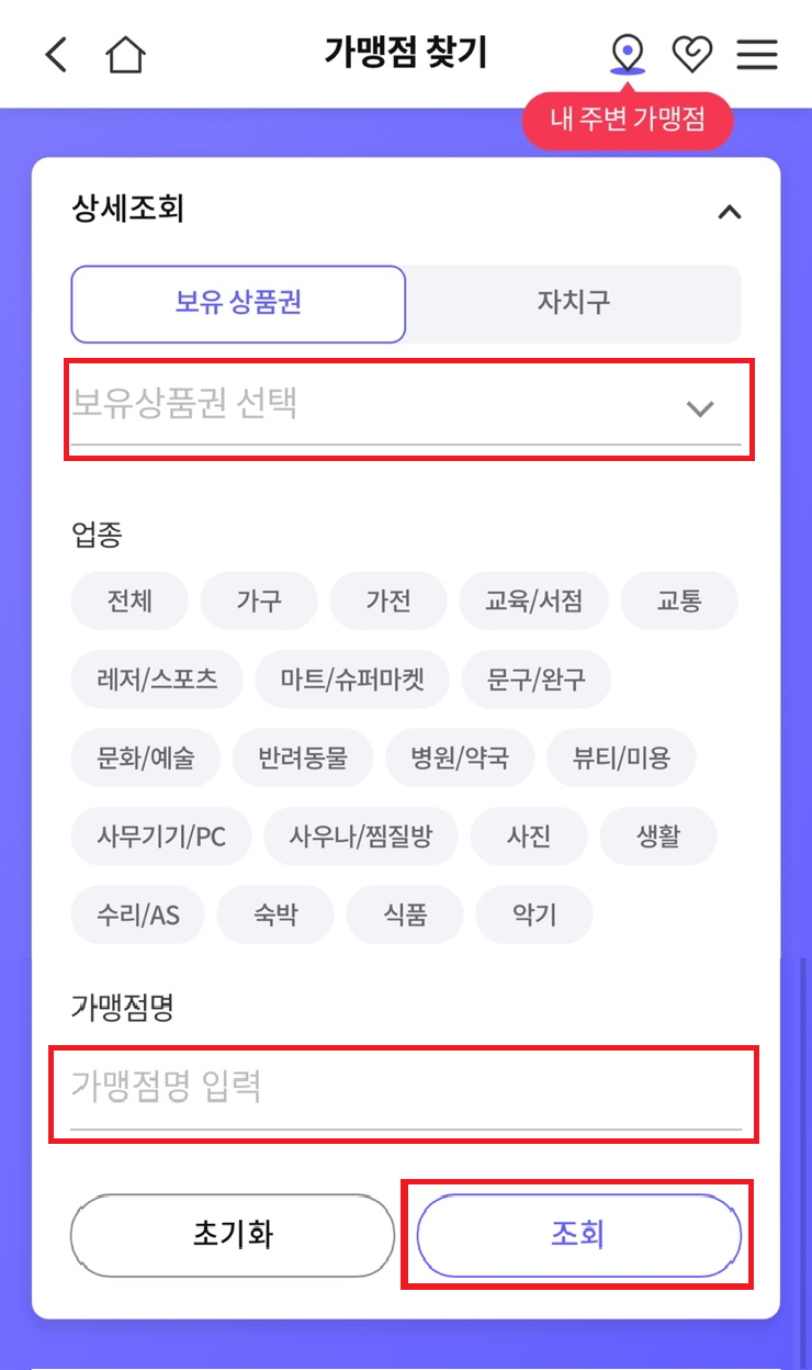 두 번째 방법은 서울 페이+ 앱을 이용하여 알 수 있습니다. 오른쪽 상단의 '三' 모양의 아이콘을 누르고 중간에 있는 가맹점을 클릭하면 서울 페이를 쓸 수 있는 가맹점과 내 주변 가맹점 등을 알 수 있습니다. 가맹점을 찾기 위해서는 보유 상품권을 선택하고 업종 정보를 선택하거나 가맹점 이름을 조회하여 서울 페이를 사용할 수 있는지 알 수 있습니다.