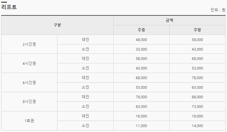리프트 이용요금의 경우 대인 기준 주말 4시간권 기준으로 68,000원이며 장비와 의류 렌탈 비용의 경우 대인 주말 4시간 기준 각각 30,000원, 22,000원입니다.